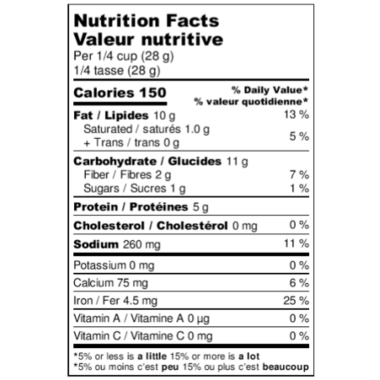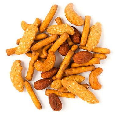Ingredients: Dry roasted almonds, Dry roasted cashews, Sugars (pretzel sticks (enriched wheat flour, salt, corn syrup, yeast)), Oat bran sesame sticks (enriched wheat flour, soybean oil, sesame seeds, oat bran, bulgur wheat, salt, beet powder, turmeric), Tamari sauce (soybeans, wheat, sea salt), Canola oil, Powders of garlic and onion, Spices