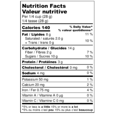 Ingredients: Sugars (dried cranberries (cranberries, cane sugar, sunflower oil), yogurt chips (sugar, palm kernel oil, whey powder, powdered whey protein concentrate, greek style yogurt powder (milk protein concentrate, skim milk powder, lactic acid, citric acid, bacterial culture), soya lecithin, sorbitan, tristearate, citric acid, natural flavour)), Roasted cashews (cashews, canola oil), Almonds, Pumpkin seeds