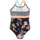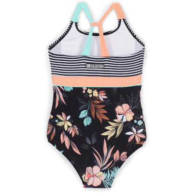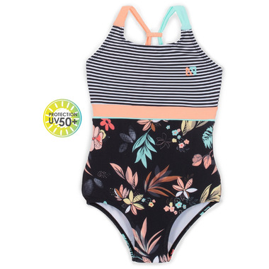 Nano's Printed one-piece with solid and striped inserts. This one-piece also has wide adjustable contrasting straps and UPF 50+ sun protection.