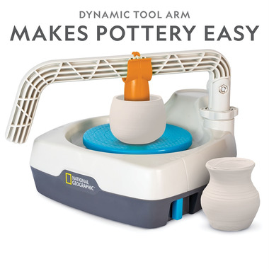 A complete pottery kit for kids and beginners. Pottery wheel includes a revolutionary tool arm that helps center, open, and shape clay. Includes 3 pounds of air-dry clay, paints, gemstone chips, and all the accessories kids need to make a masterpiece!