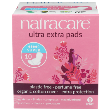 NatraCare Ultra Extra Pads with Wings to help them fit securely. These pads are made of a soft certified organic cotton next to the skin and a waterproof plant based back with a double absorbent cellulose core to keep you dry.  Free from perfumes and dyes and chlorine free, you can feel comfortable and safe using Natracare Pads.