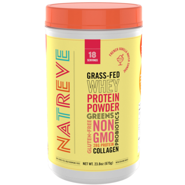 Natreve Whey Protein Powder contains 100% grass-fed, hormone-free whey protein isolate with the added benefit of 2 grams of sustainably sourced marine collagen, organic greens & probiotics. Rich in amino acids and easy to digest while lactose-free, our Whey Protein is Non-GMO Project Verified, Informed Sport Certified, and Gluten-Free. This product contains no added sugar and is made with no artificial colors, flavors, or sweeteners.