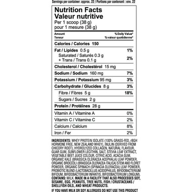 Ingredients: Whey Protein Isolate (100% Grass-Fed, Rgbh Hormone Free, New Zealand Whey), Inulin (Derived From Chicory Root), Hydrolyzed Collagen, Natural Flavour, Guar Gum, Sunflower Lecithin, Salt, Stevia Leaf Extract, Vegetable Beet Juice Colour, Citric Acid, Acacia Gum, Organic Kale (Brassica Oleracea Acephala) Leaf Powder, Organic Broccoli (Brassica Oleracea Italica) Stem And Floret Powder, Organic Spinach (Spinacia Oleracea) Leaf Powder, Probiotic Blend (Lactobacillus Acidophilus, Bifidobacterium Bififdum, Bifidobacterium Infantis, Bifidobacterium Longum).