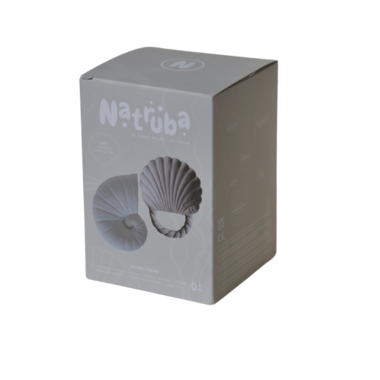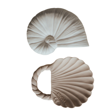 Bath toy. Made of natural rubber, without holes or valves, so that mold cannot form inside. Set of 2 pieces; Textured nautilus and textured shell. Nautilus is hollow, Shell with textured handle, concaves.