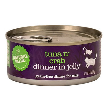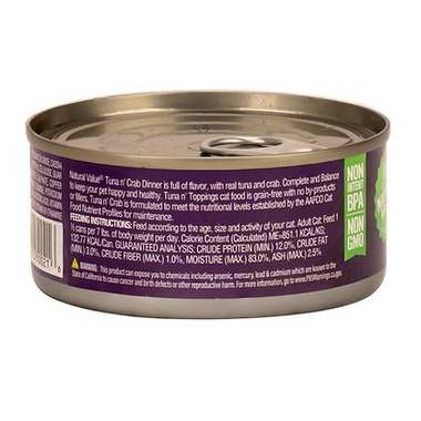 Natural Value Tuna n' Crab Dinner is full of flavour, with real tuna and crab. Complete and Balance to keep your pet happy and healthy. Tuna n' Toppings cat food is grain-free and with no by-products or fillers. Tuna n' Crab is formulated to meet the nutritional levels established by the AAFCO Cat Food Nutrient Profiles for maintenance.