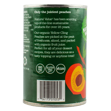 Natural Value's organic Yellow Cling Peaches are picked at the peak of freshness, chopped, and packed with organic fruit juice. Perfect for all of your dessert recipes, they are delicious as a tasty topping or anytime treat!