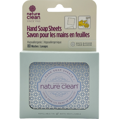 Nature Clean's hand soap sheets dissolve fully once wet to deliver a creamy lather that leaves hands feeling clean and soft. These sheets are pre-measured, easy to use and easy to store, making them great for your home, travel, camping, and school. This product is hypoallergenic and lightly scented with essential oils. It is without parabens, phthalates, phosphates or dyes, and comes in a reusable tin, making it an eco-friendly alternative to single-use plastic bottles and hand soaps.