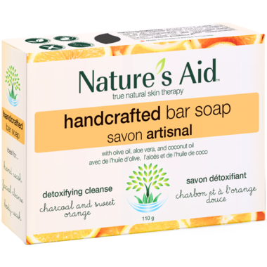 Nature's Aid's Detoxifying Bar Soap contains activated charcoal that gives skin a deep clean as it binds to dirt and helps pull it out of your pores & sweet orange extract that is a detoxifying and toning oil with a calming effect that helps rejuvenate the skin.
