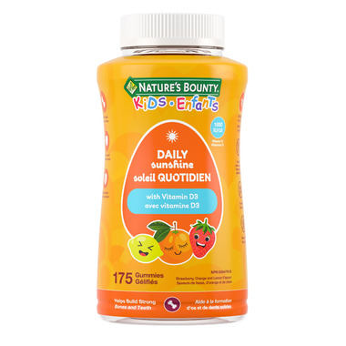 NATURE'S BOUNTY KIDS Daily Sunshine With Vitamin D3 gummies help support immune function. They also help in the development and maintenance of bones and teeth and in the absorption and use of calcium and phosphorus. These gummies contain only 1g sugar each, are gluten-free, non-GMO, have no artificial colours or flavours, and come in great tasting strawberry, orange, and lemon flavours.