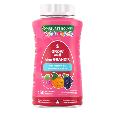 NATURE'S BOUNTY KIDS Grow Well With Vitamin B12 gummies help prevent vitamin B12 deficiency and helps form red blood cells. They help in energy metabolism in the body and in the normal function of the immune system. In addition they help maintain the body's ability to metabolize nutrients and are a factor in normal growth and development. These gummies contain only 1g sugar each, are gluten-free, non-GMO, have no artificial colours or flavours, and come in great tasting berry, orange, and raspberry flavours.