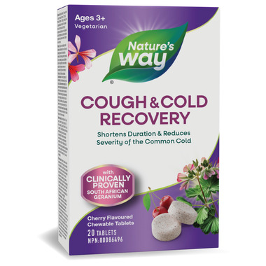 Nature's Way Cough & Cold Recovery is made from a proprietary extract of Pelargonium sidoides (African Geranium) root. It is clinically proven, in more than 25 scientific studies, to reduce symptom severity of the common, cold, bronchitis, laryngitis and sore throat. Nature's Way Cough & Cold Recovery is non-drowsy and is suitable for children.