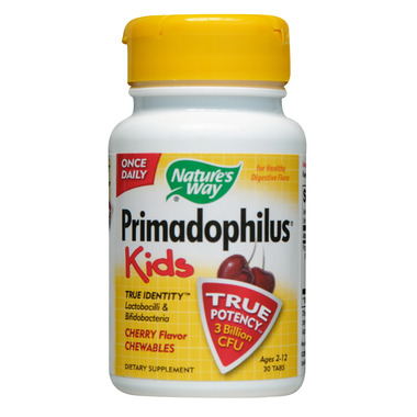 Nature's Way Primadophilus Kids provides 3 billion CFUs of 3 strains of probiotics in a delicious cherry flavoured tablet! Primadophilus's lactobacillus formula (acidophilus and rhamnosus) is specifically designed to meet the needs of kids aged 2-12.