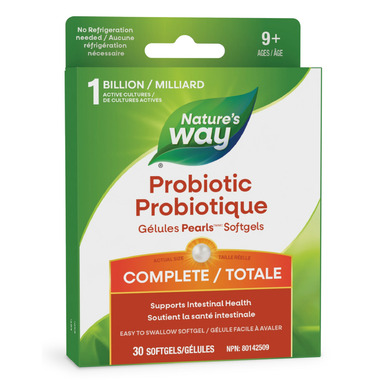 - SUPPORTS INTESTINAL HEALTH Easy -to-Swallow Softgels Nature's way Probiotic Pearls; Complete delivers 1 billion active cultures in every dose. Its formulated with a premium blend of 6 probiotic strains including Lactobacillus, Bifidobacterium, and the clinically studied HOWARU; Lactobacillus acidophilus (NCFM) to support intestinal health and promote a favourable gut flora. Suitable for adults, adolescents, and children aged 9 and older, all in just one easy-to-swallow small pearl probiotic softgel per day.