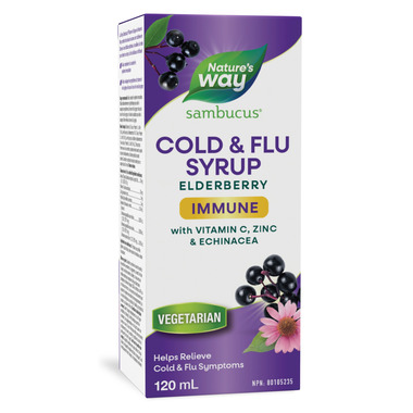 Looking for a natural health product to support your immune system this cold and flu season? Look no further than Nature's Way Sambucus Immune Cold & Flu Care Syrup. This Elderberry formula with Vitamin C and Zinc is traditionally used in Herbal Medicine to help maintain and support the immune system and to help relieve symptoms of colds and flus. This delicious tasting elderberry syrup contains a blend of  immune-supporting ingredients; 50 mg of Black Elderberry, 50 mg of Vitamin C, 5 mg of Zinc, 3 mg of Propolis and 0.104 mL of Echinacea Extracts per each serving of 5 mL. Elderberry is also a source of antioxidants. Bonus? It’s a taste everyone will love, and the syrup is vegetarian.