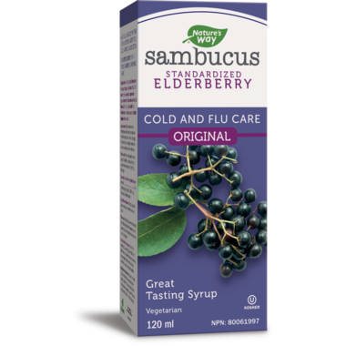 - QUALITY INGREDIENTS: Nature's Way Original Sambucus Cold and Flu Care Syrup contains 100 mg of European Elderberry per serving. This tasty syrup is gluten-free, vegetarian and contains no artificial colours or flavours.