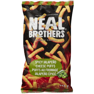 So good together. Time to kick up the heat with Neal Brothers Spicy Jalapeno cheese puffs. Guaranteed to spice up you life! Made with no artificial flavours, colours or preservatives. These have an extraordinary taste and are made with simple ingredients.