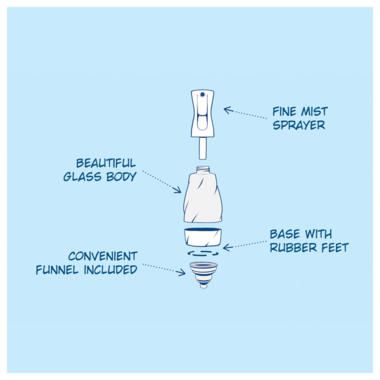 As we move to replace our plastic bottles with glass packaging, we are also eliminating spray nozzles. Why? Most spray nozzles are made up of both plastic and metal pieces – this combination of materials means they can’t be recycled. Our planet doesn’t need any more garbage – the One Bottle is our solution.