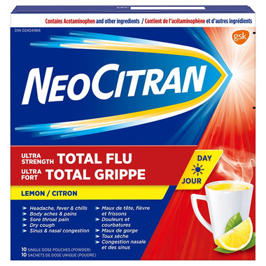 NeoCitran Ultra Strength Total Flu Non-Drowsy Lemon is NeoCitran's strongest flu formula, offering the most pain relief and decongesting medicine of any NeoCitran product in a non-drowsy daytime formula so you can carry on about your day. It provides effective relief from dry cough, fever, sore throat pain, body aches and pains, and sinus and nasal congestion.