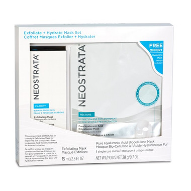 This unique mask set features an overnight Exfoliating Mask for improved skin clarity and a Pure Hyaluronic Acid Biocellulose Mask for intense hydration.