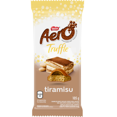 An Aero tiramisu truffle bar with a caramelized white chocolate center in a milk chocolate shell. This bar also has a coffee flavoured truffle filling. Feel the bubbles melt!