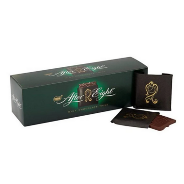 After Eight individually wrapped chocolates. Dark chocolate enveloping refreshing mint flavour.