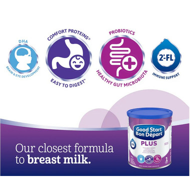 GOOD START is Pediatricians #1 choice for the easiest formula on baby's tummy. Their closest formula to breast milk, GOOD START PLUS 1 Powder baby formula is easy to digest and contains COMFORT PROTEINS, 100 percent whey proteins partially broken down using their unique process for small tummies. This baby formula also contains DHA, an Omega-3 fat that supports baby's physical brain and eye development. The probiotic B. lactis and 2'-FL, an oligosaccharide, in this powder formula help support baby's developing immune system and gut health. More pediatricians trust GOOD START as the easiest on baby's tummy than any other routine infant formula brand. December 2023. Data on file. Like all infant formulas.