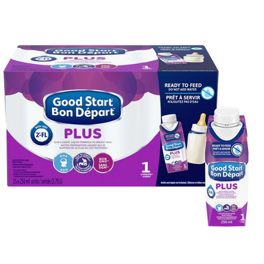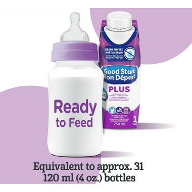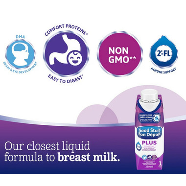 GOOD START is Pediatricians #1 choice for the easiest formula on baby's tummy. GOOD START PLUS 1 Ready-to-Feed baby formula is designed for babies from birth (0 months) and older and is their closest liquid formula to breast milk. It's convenient and easy-to-use, with no water, measuring, or mixing required. Just shake well, remove cap, and twist on a sterilized, standard size nipple and ring. GOOD START PLUS 1 Ready-to-Feed is easy to digest and contains COMFORT PROTEINS, 100 percent whey proteins partially broken down using their unique process for small tummies. This baby formula is non-GMO, contains DHA, an Omega 3 fat that contributes to your baby's normal physical brain and eye development, and has 2'-FL, an oligosaccharide. 2'-FL helps support baby's developing immune system and gut health. (2-4)