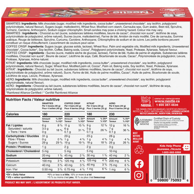 AERO Milk chocolate (sugar, modified milk ingredients, cocoa butter*, unsweetened chocolate*, soy lecithin, polyglycerol polyricinoleate, natural flavour). *Rainforest Alliance Certified KITKAT Milk chocolate (sugar, modified milk ingredients, cocoa butter*, unsweetened chocolate*, soy lecithin, polyglycerol polyricinoleate, natural flavour), Sugar, Wheat flour, Modified palm oil, Cocoa*, Palm oil, Baking soda, Soy lecithin, Yeast, Protease, Xylanase. * Rainforest Alliance Certified SMARTIES Milk chocolate (sugar, modified milk ingredients, cocoa butter*, unsweetened chocolate*, soy lecithin, polyglycerol polyricinoleate, natural flavour), Sugars (sugar, maltodextrin), Wheat flour, Modified corn starch, Carnauba wax, Gum arabic, Beet red, Spirulina, Turmeric, Carotene, Anthocyanin, Sodium copper chlorophyllin. *Rainforest Alliance Certified COFFEE CRISP Sugars (sugar, glucose solids, lactose), Wheat flour, Palm and vegetable oils, Modified milk ingredients, Unsweetened chocolate*, Cocoa butter*, Soy lecithin, Coffee, Baking soda, Cocoa*, Polyglycerol polyricinoleate, Yeast,?Protease, Xylanase, Natural flavour. *Rainforest Alliance Certified