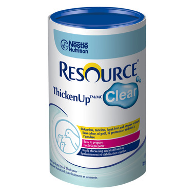 Resource ThickenUp Clear is a xanthan-based powdered thickener that remains clear, lump-free, tasteless, odourless, and maintains consistency over time after mixing.  Resource ThickenUp Clear is clinically demonstrated to improve swallowing safety.  Can be added to most hot and cold liquids.  For the nutritional management of dysphagia.