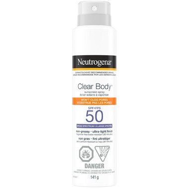 - Neutrogena Clear Body Sunscreen Spray with Broad Spectrum SPF 50 suitable for all skin types & ideal for oily skin. Keep this non-greasy spray sunscreen with your beach supplies for 80 minutes of water-resistant sun protection & sunburn prevention