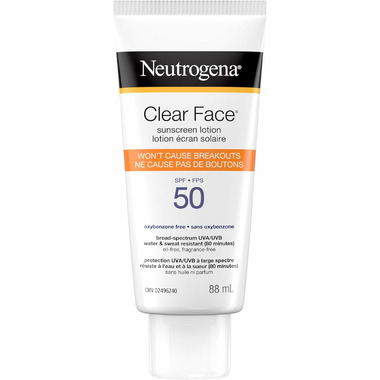 Neutrogena Clear Face Sunscreen Lotion SPF 50 88 mL is perfect for the face and the body. This non-comedogenic sunscreen provides broad-spectrum UVA/UVB protection with a clinically-tested formula that won't clog pores and won't cause breakouts. This makes it ideal for acne-prone skin. This liquid sunscreen lotion has a water-light texture that leaves a weightless, matte finish so skin can breathe. Made water and sweat resistant for up to 80 minutes. Oil-free and unscented. In an airport-friendly size of 88 mL. Oxybenzone free formulation.