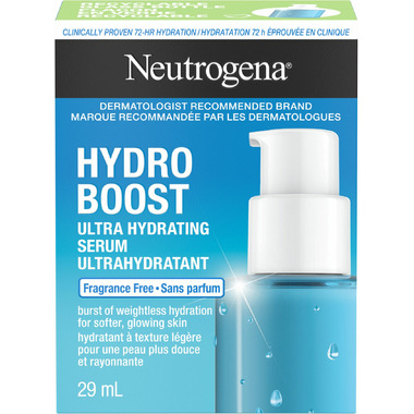 Enjoy 72 hours of skin hydration with Neutrogena Hydro Boost Ultra Hydrating Serum. This lightweight face serum is formulated with hyaluronic acid, amino acids, and electrolytes for dry, sensitive, and acne prone skin. Hyaluronic acid is a dermatologist-recommended hydrator found naturally in the skin that binds to water and holds it within skin's surface. Amino acids and electrolytes, part of the skin's Natural Moisturizing Factors, help attract water and restore the skin's moisture balance instantly and over time. Clinically proven to provide a full 72 hours of skin-quenching hydration, this facial serum instantly improves the look and feel of dry, sensitive, and acne prone skin. This face serum delivers weightless hydration to reveal glowing, softer skin. To use, apply the serum for dry skin evenly to face and neck daily after cleansing skin. After two weeks of regular use the skin will feel revitalized and replenished; after four weeks of regular use the skin will feel more resilient. Use as part of your daily skincare routine. This lightweight formula is non-comedogenic, non-greasy, fragrance-free, dye-free, paraben-free, and phthalate-free, making it a great option for acne-prone and sensitive skin. Comes with one 29-millilitre glass bottle of facial serum.