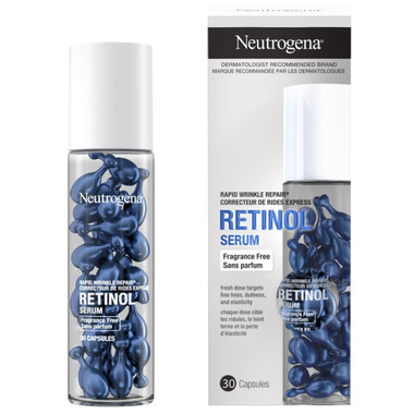 Neutrogena Rapid Wrinkle Repair Retinol Serum Capsules provide a fresh dose of pure retinol to target multiple signs of aging and leaves brighter, more radiant skin in just one week. Each fragrance-free capsule contains a precise dose of pure retinol, a potent form of vitamin A that targets fine lines, dullness, and elasticity. Each precise dose of pure retinol targets signs of aging including fine lines, dullness & elasticity. After one week, skin looks brighter and more radiant, and after two weeks, the serum helps fade the look of wrinkles and fine lines. After 4 weeks, this retinol serum improves the look of skin's elasticity for more revitalized-looking skin. The hypoallergenic and non-comedogenic Retinol Serum Capsules are gentle enough to use daily on all skin tones. These water-biodegradable capsules from a dermatologist-recommended brand provide mess-free application at home or on the go. Apply the serum nightly after cleansing and before moisturizing by twisting open the capsule and smoothing over face. Each bottle contains 30 Retinol Serum Capsules. Fight the signs of aging with Neutrogena Rapid Wrinkle Repair Retinol Serum Capsules.