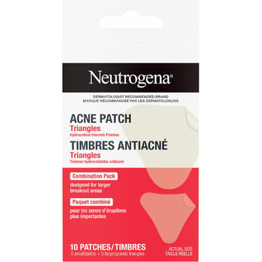 - 10-count combination pack of Neutrogena Acne Hydrocolloid Blemish Patches includes 5 small triangles and 5 large triangles to remove impurities from the skin to help pimples look visibly smaller and flatter after one use