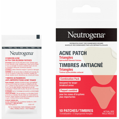 Neutrogena Triangle Acne Patches remove impurities from skin to help popped pimples look smaller & flatter in just one use. During clinical testing, over 90% saw flatter looking pimples by the next day. Ideal for acne-prone skin, these hydrocolloid blemish patches from a dermatologist recommended brand are easy to use & will start to turn white as they absorb fluids to show they're working. The ultra-thin, acne patches provide an optimal healing environment to help protect pimples from being picked. The combo pack of allergy-tested, fluid-absorbing patches contains two sizes. Small triangles are ideal for use on t-zone clusters on the chin, nose & forehead. Large triangles are ideal for use on larger breakouts along the cheek, jawline, forehead, back & chest.