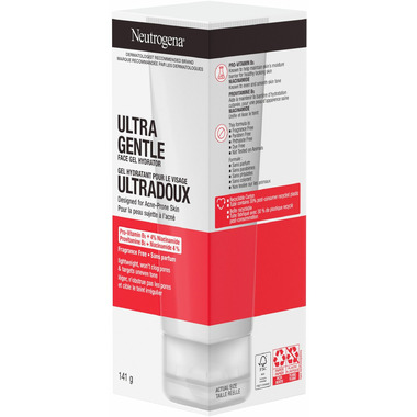 Neutrogena Ultra Gentle Face Gel Hydrator moisturizes dry skin while evening skin tone. This gel moisturizer helps maintain skin's moisture barrier with Pro-vitamin B5 and even skin with niacinamide. This gel moisturizer for acne-prone skin defends against dryness and smooths skin. Suitable for sensitive skin, this fragrance-free, non-comedogenic gel cream helps defend against dryness caused by acne treatments without clogging pores which can cause breakouts. This gentle facial moisturizer is formulated with Pro-Vitamin B5, an ingredient known to help maintain skin's moisture barrier, and 4% niacinamide, to even and smooth skin tone for a healthy looking complexion.