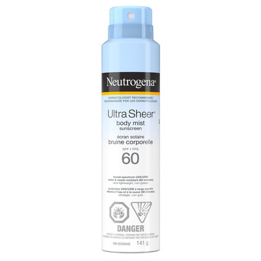 Neutrogena Ultra Sheer Body Mist Sunscreen Spray with Broad Spectrum SPF 60 provides effective sun protection in an easy-to-use spray bottle. This oil-free sunscreen provides effective UVA and UVB protection and is water-resistant for up to 80 minutes. The non-greasy formula provides a sheer, ultra-lightweight finish and is non-comedogenic, so it won't clog pores. Plus, it's oxybenzone-free.