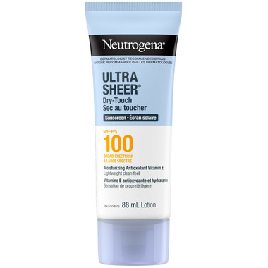 Help prevent sunburn and protect the skin from early signs of sun aging when used as directed with other sun protection measures with Neutrogena Ultra Sheer Dry-Touch Sunscreen SPF 100. Its maximum protection* you can't feel (*highest SPF within Ultra Sheer line) This sheer sunscreen provides broad-spectrum protection, protecting against UVA rays and blocking up to 99% of skin-burning UVB rays. This formula combines broad spectrum UVA/UVB protection with moisturizing antioxidant vitamin E. This sunscreen lotion has a lightweight feel and utilizes dry-touch technology for a matte finish and is free from oxybenzone, PABA, para-ben, phthalates, and dyes.
