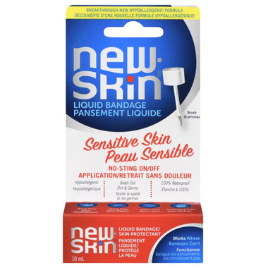 New-Skin Sensitive Skin Ζ designed for easily irritated skin. It goes on sting-free and when you are ready to remove it, wash off with soap or allow it to fall off naturally as you heal. No more painful removal of adhesive bandage. The unique hypoallergenic, fragrance-free and waterproof formula is created without alcohol or dyes to ensure it is gentle on the skin. New Skin creates a flexible, breathable shield that blocks out water, dirt and germs. New Skin Sensitive Skin Stays where bandages don't.