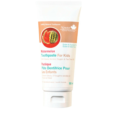 Newco Watermelon Natural Toothpaste is an all natural Sodium Lauryl Sulphate-free toothpaste enhanced with Aerobic Oxygen and Tea Tree Oil. Baking Soda and Calcium Carbonate provides a gentle, non-abrasive cleanse using Yucca as the foaming agent.  The naturally preserved formula is sweetened with Stevia.