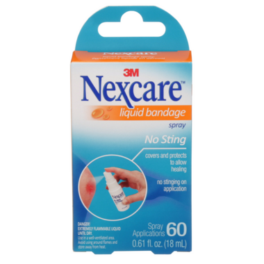 Nexcare Liquid Bandage Spray forms a protective coating over minor skin scrapes and abrasions to help keep water and dirt from entering the wound. Ideal for helping protect abrasions in hard-to-cover areas, Nexcare Liquid Bandage Spray stays on even during swimming or outdoor activities and is an essential item for your first-aid arsenal.