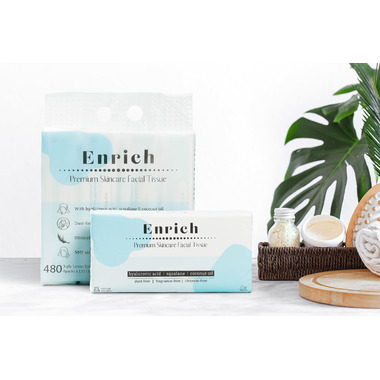 The ingredients in Enrich tissues are purely plant-based and proven skin-friendly - includes vegan hyaluronic acid, olive-derived squalane and organic coconut oil.