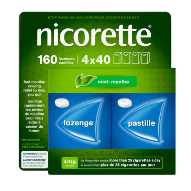 - Nicorette Mint 4mg Lozenges delivers small amounts of nicotine tohelp relieve cravings quickly. These nicotine lozenges are made for those who smoke more than 25 cigarettes a day. This pack comes with 160 lozenges.
