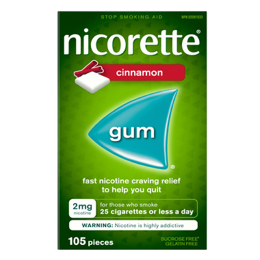 Nicorette Gum works fast to relieve your cravings plus withdrawal symptoms to help you quit smoking. Containing 2 milligrams of nicotine per piece, this gum helps fight the craving to smoke and helps reduce unpleasant withdrawal symptoms. Using Nicorette Gum correctly can double your chances of quitting versus willpower alone. Chew a piece of this Nicorette gum whenever you feel the urge to smoke, up to 20 times a day. This nicotine-based gum is indicated for adults smoking 25 cigarettes or less a day, who want to quit smoking immediately or quit gradually by reducing the amount of cigarettes they smoke each day.
