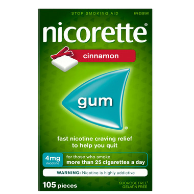Nicorette Gum works fast to relieve your cravings plus withdrawal symptoms to help you quit smoking. Containing 4 milligrams of nicotine per piece, this gum helps fight the craving to smoke and helps reduce unpleasant withdrawal symptoms. Using Nicorette Gum correctly can double your chances of quitting versus willpower alone. Chew a piece of this Nicorette gum whenever you feel the urge to smoke, up to 20 times a day. This nicotine-based gum is indicated for adults smoking 25 cigarettes or more a day, who want to quit smoking immediately or quit gradually by reducing the amount of cigarettes they smoke each day.