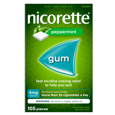 Nicorette Gum works fast to relieve your cravings plus withdrawal symptoms to help you quit smoking. Containing 4 milligrams of nicotine per piece, this gum helps fight the craving to smoke and helps reduce unpleasant withdrawal symptoms. Using Nicorette Gum correctly can double your chances of quitting versus willpower alone. Chew a piece of this Nicorette gum whenever you feel the urge to smoke, up to 20 times a day. This nicotine-based gum is indicated for adults smoking 25 cigarettes or more a day, who want to quit smoking immediately or quit gradually by reducing the amount of cigarettes they smoke each day.