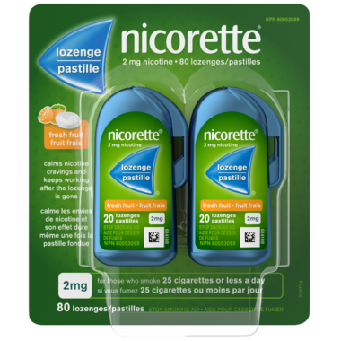 NICORETTE Lozenges allow you to experience all the effective craving and withdrawal relief of NICORETTE in a lozenge. With 2 milligrams of nicotine, each lozenge helps you fight cravings and end withdrawal symptoms to help you quit smoking. Using NICORETTE Lozenges correctly can double your chances of quitting versus willpower alone. Place one of these NICORETTE mint-flavoured lozenges in your mouth whenever you feel the urge to smoke, up to 15 times a day. These lozenges are indicated for adults smoking one pack or less a day, who want to stop smoking.