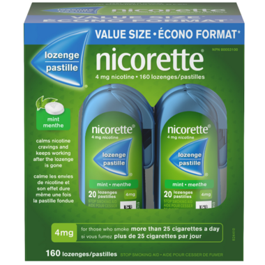 NICORETTE Lozenges allow you to experience all the effective craving and withdrawal relief of NICORETTE in a lozenge. With 4 milligrams of nicotine, each lozenge helps you fight cravings and end withdrawal symptoms to help you quit smoking. Using NICORETTE Lozenges correctly can double your chances of quitting versus willpower alone. Place one of these NICORETTE mint-flavoured lozenges in your mouth whenever you feel the urge to smoke, up to 15 times a day. These lozenges are indicated for adults smoking more than one pack a day, who want to stop smoking. Value pack of 160 Count