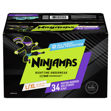 Introducing Ninjamas Nighttime Underwear! Take on bedwetting accidents and wake up confident with our All-Night Leak Protection. Our exclusive Pampers Lock-Away Channels absorb and distribute wetness quickly & evenly for powerful protection you've never seen. Our built-in OdorMask Technology activates when bedwetting accidents happen to help conquer smells so kids can wake up feeling great each day. Ninjamas are also uniquely designed for kids with a Form-Fit Waistband that flexes for a sleek, underwear-like fit. Our super stealthy nighttime underwear discreetly fits around kids' waist and sides and provides breathable comfort, just like cotton underwear!