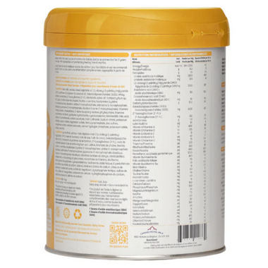 Skim milk, Lactose, Mixed vegetable oil (1,3,-dioleoyl-2-palmitoyl triglyceride (OPO), sunflower oil, soybean oil, coconut oil), Galactooligosaccharides (GOS), Whey protein concentrate, 2-fucosyllactose (2'-FL), Mortierella alpina oil҆, Schizochytrium sp.oil, Lutein, Choline bitartrate, Inositol, Taurine, L-carnitine, Nucleotides (cytidine 5'-monophosphate, disodium uridine 5'-monophosphate, adenosine 5'-monophosphate,disodium guanosine-5'-monophosphate, disodium inosine-5'-monophosphate), Vitamins(retinyl acetate, cholecalciferol, D-alpha-tocopheryl acetate, phylloquinone, thiamine mononitrate, riboflavin, pyridoxine hydrochloride, cyanocobalamin, niacinamide, folic acid, calcium D-pantothenate, sodium ascorbate, biotin), Minerals (sodium citrate, potassium chloride, copper sulfate, magnesium sulfate, ferric pyrophosphate, zinc sulfate, manganese sulfate, calcium carbonate, calcium hydrogen phosphate, potassium iodide, sodium selenite).